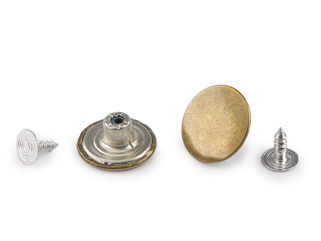 • Egy fém farmergomb két részből áll, amelyeket össze kell ütögetni (például kalapáccsal).
