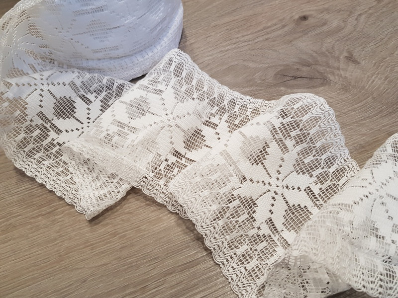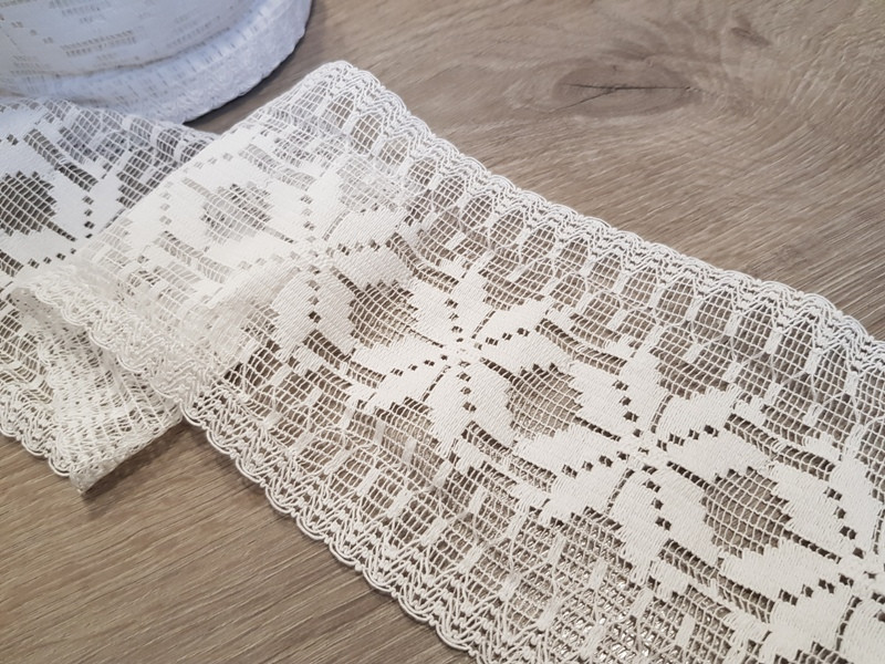 Gyönyörű kevertszálas pamut szalag csipke 12,5cm széles, ruházati és kézműves célokra.
