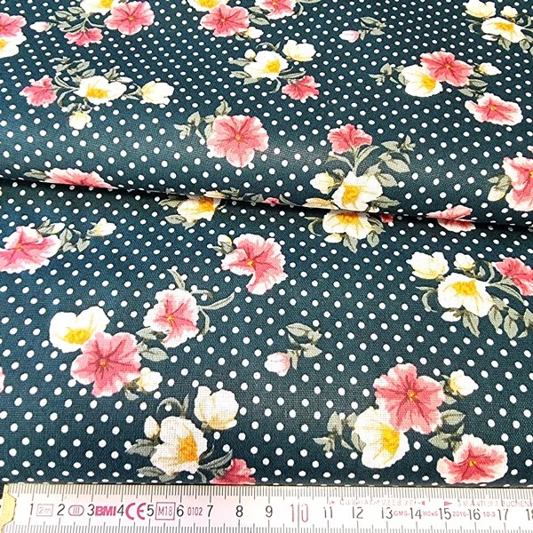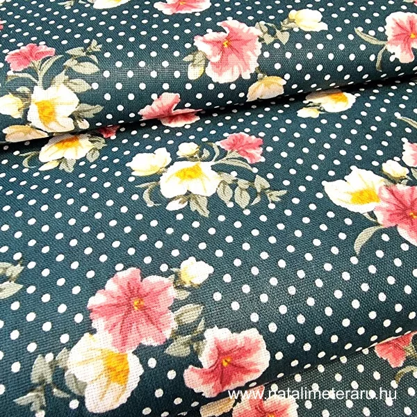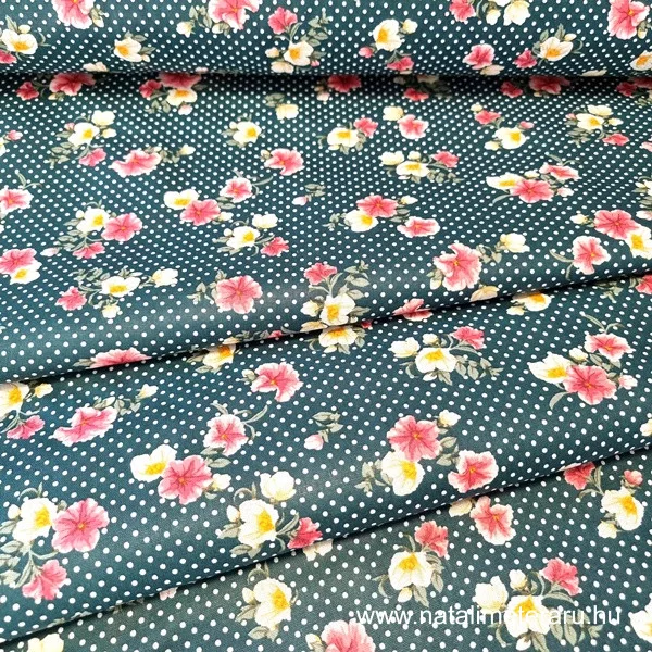 Sötét zöld, pöttyös, virágos pamutvászon