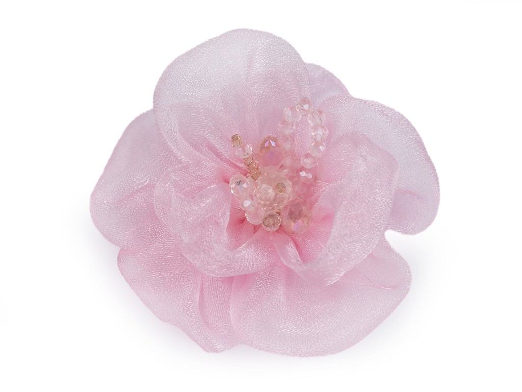 Egy romantikus, lágy csillogó organzából készült textilvirágot középen kidolgozott , vágott gyöngyökből készült bibék díszítenek. Nekik köszönhetően gyönyörűen csillog. A virág felhasználási területe széles. Gazdag virágszirmokkal rendelkezik, így bolyhos megjelenést kölcsönöz neki. Alsó részén textil kerék található, mellyel kényelmesen bárhova rögzítheted. Varrható, ragasztható. Használata: A virágot felvarrhatod dekorációként partiruhákra, blúzokra, pólókra vagy pulóverekre. Kalapok, sapkák és fejpántok díszítésére is alkalmas. Ragasztóval is felragaszthatod a brosshídra , és érdekes ékszert készíthetsz belőle.