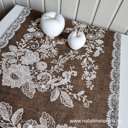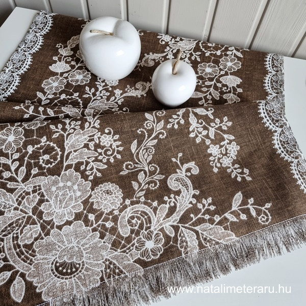 Melánzs barna, fehér csipke mintás asztalifutó 1,8m