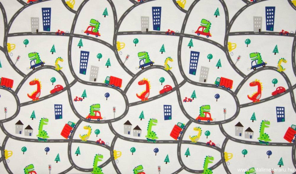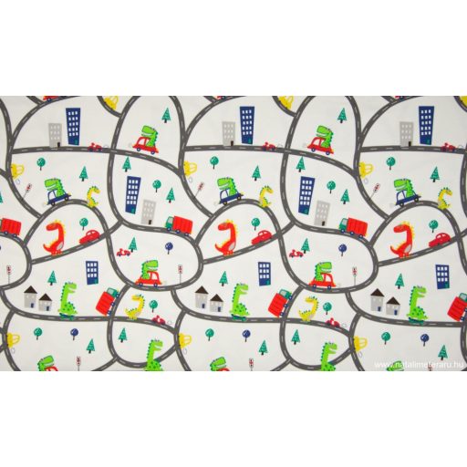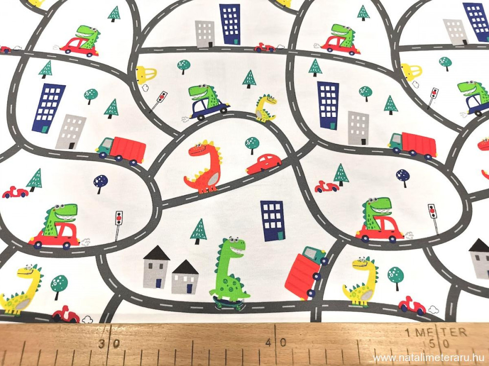 Utazó dinók fehér alapon elasztikus pamut jersey